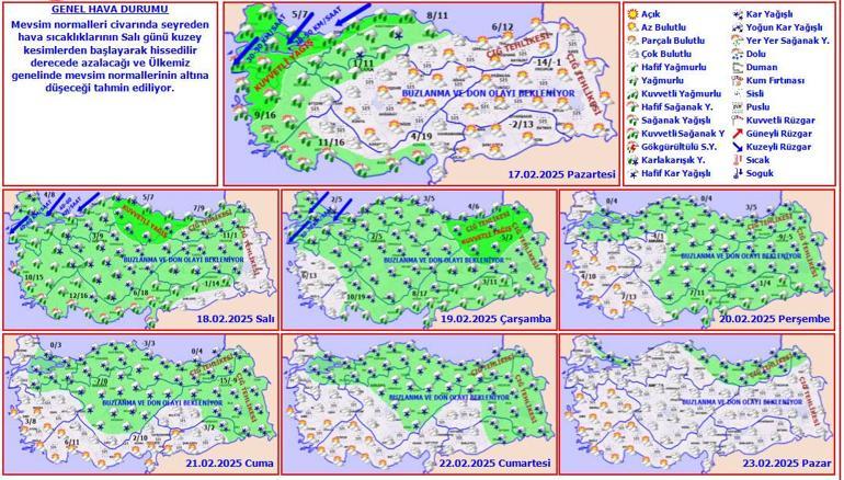 Meteoroloji Genel Müdürlüğü tarafından yapılan tahminlere göre: Ülkemiz genelinin parçalı ve çok bulutlu, Marmara, Ege, Akdeniz, İç Anadolu’nun kuzeybatısı, Batı ve Orta Karadeniz ile Güneydoğu Anadolu’nun batısının yağışlı geçeceği tahmin ediliyor. Genellikle yağmur ve sağanak, İç Ege’nin yüksekleri, Batı ve Orta Karadeniz’in iç kesimleri ile İç Anadolu’da karla karışık yağmur ve kar şeklinde olması beklenen yağışların, Marmara, Kuzey Ege ve Batı Karadeniz kıyılarında kuvvetli olması bekleniyor. Yurdun iç ve doğu kesimlerinde buzlanma ve don ile birlikte pus ve yer yer sis hadisesi görüleceği tahmin ediliyor. Doğu Karadeniz’in iç kesimlerinin yüksekleri ile Doğu Anadolu’nun yüksek ve dik yamaçlarında çığ tehlikesi bulunmaktadır.