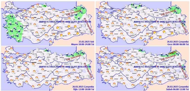 ÇIĞ TEHLİKESİ İLE BUZLANMA VE DON OLAYI UYARISI: Doğu Karadeniz’in iç kesimlerinin yüksekleri ile Doğu Anadolu’nun doğusunun dik ve eğimli yamaçlarında çığ tehlikesi ile yurdun kuzey, iç ve doğu kesimlerinde yer yer kuvvetli olmak üzere buzlanma ve don olayı beklendiğinden meydana gelebilecek olumsuzluklara karşı dikkatli ve tedbirli olunması gerekmektedir.