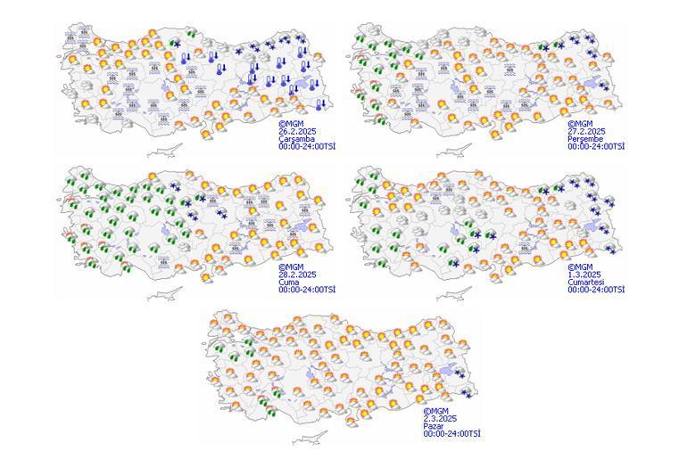 Parçalı ve az bulutlu, batısının çok bulutlu, Batı Akdeniz’in batısının yağmurlu geçeceği tahmin ediliyor. Sabah ve gece saatlerinde iç kesimlerinde buzlanma ve don ile birlikte pus ve yer yer sis bekleniyor.