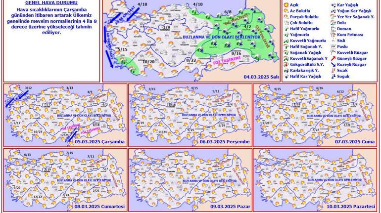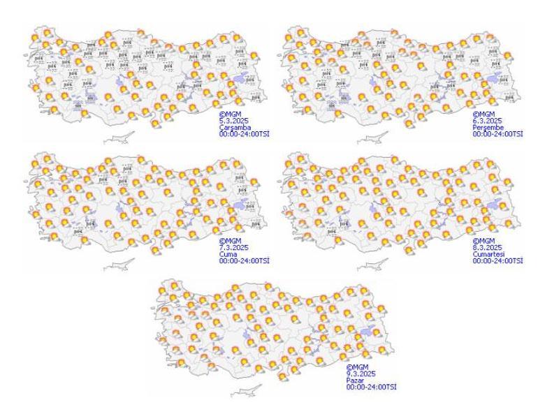 Meteoroloji Genel Müdürlüğü tarafından yapılan tahminlere göre: Ülkemiz genelinde yağış beklenmiyor. Orta ve Doğu Karadeniz kıyılarının parçalı bulutlu, diğer yerlerin az bulutlu ve açık geçeceği tahmin ediliyor. Rüzgarın; kuzeyli yönlerden, Çanakkale çevrelerinde kuvvetli (30-50 km/saat), Doğu Akdeniz’in doğusunda fırtına (40-60 km/saat) şeklinde esmesi bekleniyor. Sabah ve gece saatlerinde iç ve doğu kesimlerde buzlanma ve don ile birlikte pus ve yer yer sis bekleniyor. Doğu Karadeniz’in iç kesimlerinin yüksekleri ile Doğu Anadolu’nun yüksek ve dik yamaçlarında çığ tehlikesi bulunmaktadır. Doğu Akdeniz ve Güneydoğu Anadolu’da toz taşınımı beklenmektedir.