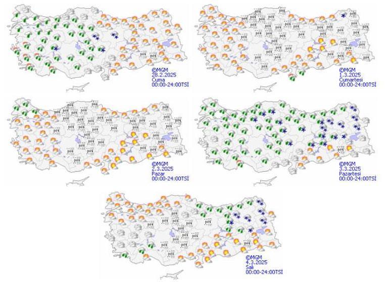 Meteoroloji Genel Müdürlüğü tarafından yapılan tahminlere göre: Ülkemiz genelinin parçalı ve çok bulutlu, Ege ile Batı Akdeniz kıyıları, Balıkesir, Çanakkale, Tekirdağ, Karabük çevreleri, Sakarya ve Düzce’nin kuzey ilçeleri yağmur ve sağanak yağışlı, bu sabah saatlerinde Rize, Artvin, Ardahan ve Van çevrelerinin karla karışık yağmur ve kar yağışlı geçeceği tahmin ediliyor. Yağışların: İzmir çevreleri ile Çanakkale’nin güneyi, Balıkesir ve Aydın’ın kıyı ilçelerinde kuvvetli sağanak şeklinde olması bekleniyor. Kuzey, iç ve doğu kesimlerde buzlanma ve don ile birlikte sis ve pus olayı bekleniyor. Doğu Karadeniz’in iç kesimlerinin yüksekleri ile Doğu Anadolu’nun yüksek ve dik yamaçlarında çığ tehlikesi bulunmaktadır.