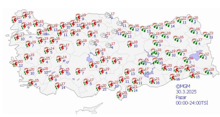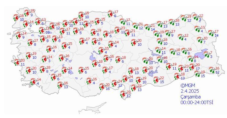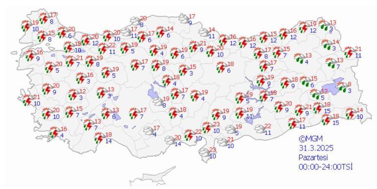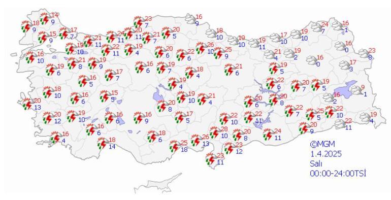 Meteoroloji Genel Müdürlüğü tarafından yapılan tahminlere göre: Ülkemiz genelinin parçalı ve çok bulutlu, Marmara, Ege, Akdeniz (Mersin hariç), İç Anadolu’nun kuzeydoğusu, Karadeniz’in iç kesimleri, Doğu ve Güneydoğu Anadolu ile Ankara, Eskişehir, Düzce ve Zonguldak çevrelerinin sağanak ve gök gürültülü sağanak yağışlı geçeceği tahmin ediliyor. Yağışların; Batı Akdeniz’in iç kesimleri ile Muğla’nın batısı, Aydın kıyıları, Balıkesir’in batısı ile İzmir’in güney ilçelerinde yerel kuvvetli olması bekleniyor. Rüzgarın; Ege, Akdeniz’in iç kesimleri, İç Anadolu’nun güney ve doğusu, Orta ve Doğu Karadeniz’in iç kesimleri ile Doğu ve Güneydoğu Anadolu’nun batısında güneyli yönlerden kuvvetlİ, İç Anadolu’da kısa süreli fırtına şeklinde (40-70 km/saat) esmesi bekleniyor. Güneydoğu Anadolu Bölgesi’nin güneyinde toz taşınımı bekleniyor.