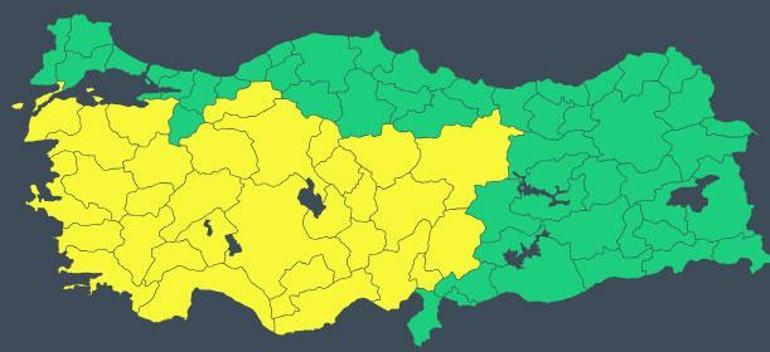 Yarın ise “Adana, Afyonkarahisar, Ankara, Antalya, Aydın, Balıkesir, Bolu, Burdur, Bursa, Çanakkale, Denizli, Eskişehir, Isparta, Mersin, İzmir, Kayseri, Kırşehir, Konya, Kütahya, Manisa, Kahramanmaraş, Muğla, Nevşehir, Niğde, Sivas, Uşak, Yozgat, Aksaray, Karaman, Kırıkkale, Osmaniye” için uyarı geldi.
