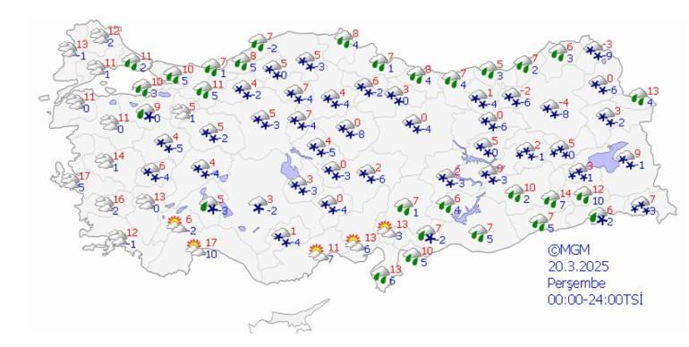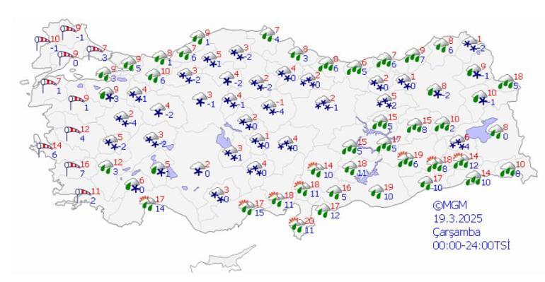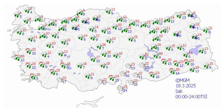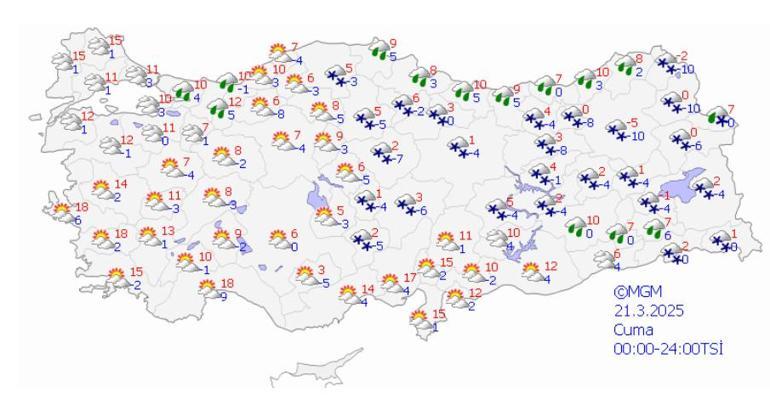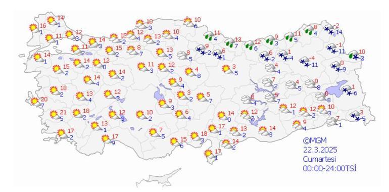 Meteoroloji Genel Müdürlüğü tarafından yapılan tahminlere göre: Ülkemiz genelinin parçalı ve çok bulutlu, Marmara, Ege (Muğla hariç), Göller yöresi, İç Anadolu (Kırşehir, Aksaray ve Karaman hariç), Karadeniz, Doğu Anadolu, Güneydoğu Anadolu’nun doğusu ile Adana’nın kuzey kesimleri, Adıyaman ve Şanlıurfa çevrelerinin aralıklı yağmur ve sağanak yağışlı geçeceği tahmin ediliyor. Yağışların, Karadeniz kıyıları (Sinop hariç) ile Edirne, Kırklareli, İstanbul, Bursa, Yalova, Kocaeli, Sakarya, Tokat, Gümüşhane, Bayburt, Erzincan ve Tunceli çevrelerinde yer yer kuvvetli olması bekleniyor. Gece ve sabah saatlerinde doğu kesimlerde buzlanma ve don olayı olacağı tahmin ediliyor. Doğu Karadeniz’in iç kesimlerinin yüksekleri ile Doğu Anadolu’nun yüksek ve dik yamaçlarında çığ tehlikesi bulunmaktadır.