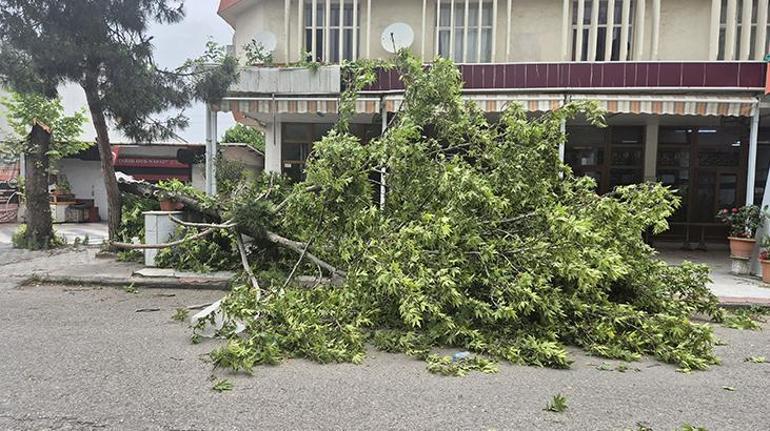 Manisa’nın Turgutlu ilçesinde şiddetli rüzgarın etkisiyle bazı ağaçlar yola devrildi, bir araç zarar gördü.