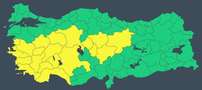 Meteoroloji bugün, “Afyonkarahisar, Ankara, Antalya, Aydın, Burdur, Denizli, Eskişehir, Isparta, İzmir, Kayseri, Kırşehir, Konya, Kütahya, Manisa, Muğla, Nevşehir, Sivas, Uşak, Yozgat” için sarı kodlu uyarıda bulundu.