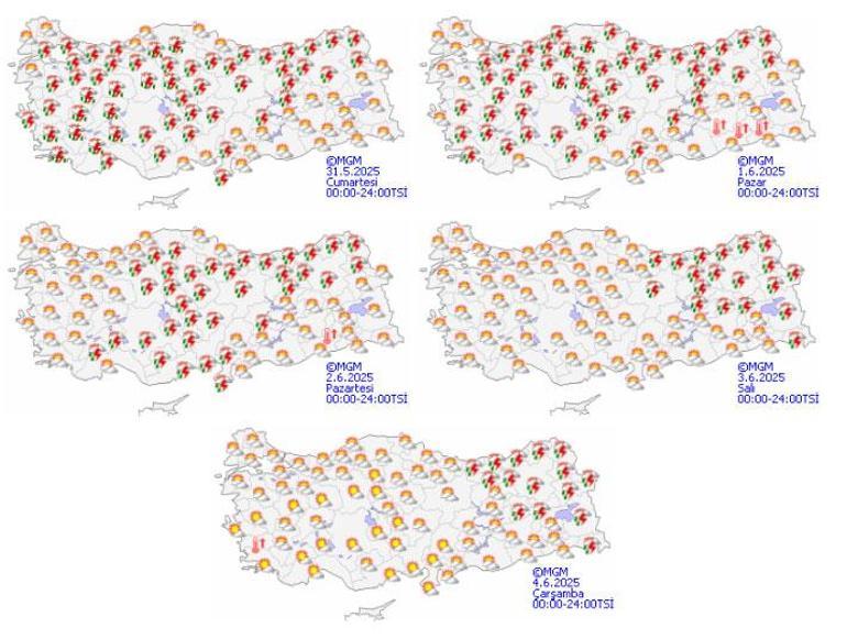 Aynı zamanda öğle saatlerinden sonra Antalya, İzmir’in güneyinde Ege ve İç Ege’nin doğusunda, Göller bölgesinde, İç Anadolu’da, Karaman’da ve Konya’nın güneyinde kuvvetli yağışlar var. Buralara dikkat etmek lazım öğle saatlerinden sonra. Çünkü su baskını yapabilir buralar. Hafta sonu, yarın İstanbul’da yağmur var. Pazar günü de yağmur var. Sıcaklık ortalamalarda yani 22-23.