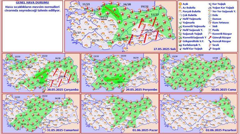 Yeni hava tahmin haritasına göre, Türkiye genelinde hava sıcaklıkları mevsim normalleri civarında seyredecek. Hafta boyunca yurdun büyük bir bölümünde sağanak ve gök gürültülü sağanak yağışlar etkili olacak. Özellikle salı ve çarşamba günleri İç Anadolu, Akdeniz’in iç kesimleri ve Doğu Karadeniz’de kuvvetli yağışlar bekleniyor. Bu bölgelerde yer yer toz taşınımı da görülecek. Güney ve doğu bölgelerde güneyli rüzgarlar dikkat çekerken, perşembe ve cuma günleri Marmara ve Ege’de yağışlar biraz azalıyor ancak cumartesiden itibaren yurdun büyük kesimi tekrar yağışlı havanın etkisine giriyor.
