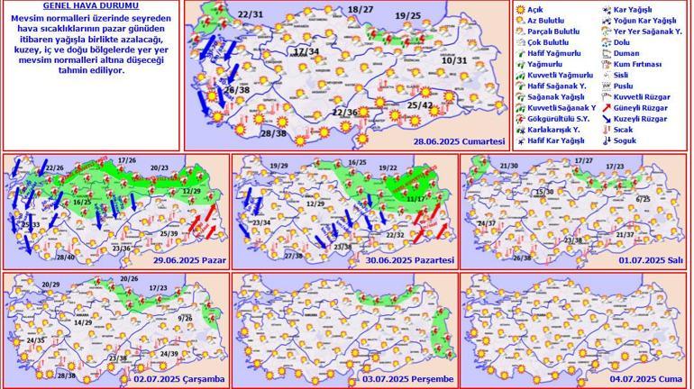 28 Haziran – 4 Temmuz 2025 haftalık hava tahmin raporuna göre Türkiye genelinde hafta sonu sıcaklıklar mevsim normallerinin üzerinde seyrederken, pazar gününden itibaren kuzey, iç ve doğu bölgelerde sağanak yağışlar ve serinleme bekleniyor.