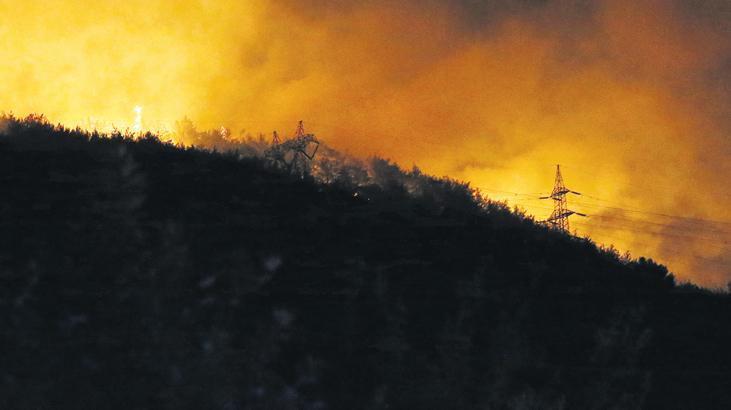 Hatay’da şiddetli rüzgarın etkisiyle çevreye yayılan orman yangınının söndürülmesi için çalışmalar hava araçları, yüzlerce araç ve personelle sürüyor. Yangında gece, gündüz mücadele eden ekipler, zaman zaman yorgun düştüğü anlarda yerde ve araçlarının bagaj kapaklarında uyuyup dinlenmeye çalışıyor. ● AA