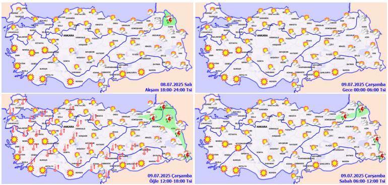 Parçalı ve az bulutlu, doğusu çok bulutlu akşam ilk saatlerde Kars’ın kuzeyi ve Ardahan çevreleri ile yarın öğle saatlerinden itibaren Van ve Hakkari’nin doğusu ile Kars, Ardahan, Ağrı çevrelerinin yerel olmak üzere sağanak ve gök gürültülü sağanak yağışlı geçeceği tahmin ediliyor.