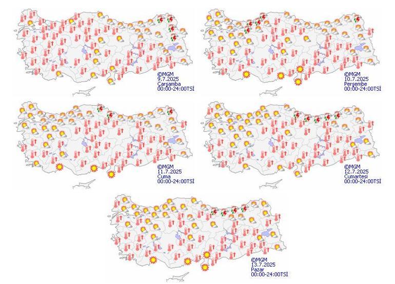 Meteoroloji Genel Müdürlüğü tarafından yapılan tahminlere göre: yurdun kuzey kesimlerinin parçalı, yer yer çok bulutlu, akşam ilk saatlerde Kars’ın kuzeyi ve Ardahan çevreleri ile yarın öğle saatlerinden itibaren Trabzon, Rize ve Artvin illerinin iç kesimleri, Van ve Hakkari’nin doğusu ile Kars, Ardahan, Ağrı çevrelerinin yerel olmak üzere sağanak ve gök gürültülü sağanak yağışlı, diğer yerlerin az bulutlu ve açık geçeceği tahmin ediliyor.