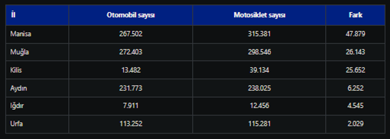Bu kapsamda, motosiklet sayısı ile otomobil sayısı arasındaki farkın en fazla olduğu il, 47 bin 879 ile Manisa olarak kayıtlara geçti.