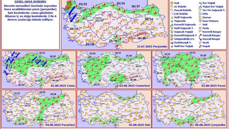 Genel olarak hafta sonuna kadar yüksek seyreden sıcaklıklar, yağışların başlamasıyla birlikte düşüşe geçecek. Marmara, Karadeniz ve İç Anadolu bölgelerinde yağışlar kısa süreli de olsa serinlik getirecek. Ancak Akdeniz ve Ege kıyılarında hava çoğunlukla açık ve sıcak kalmaya devam edecek.