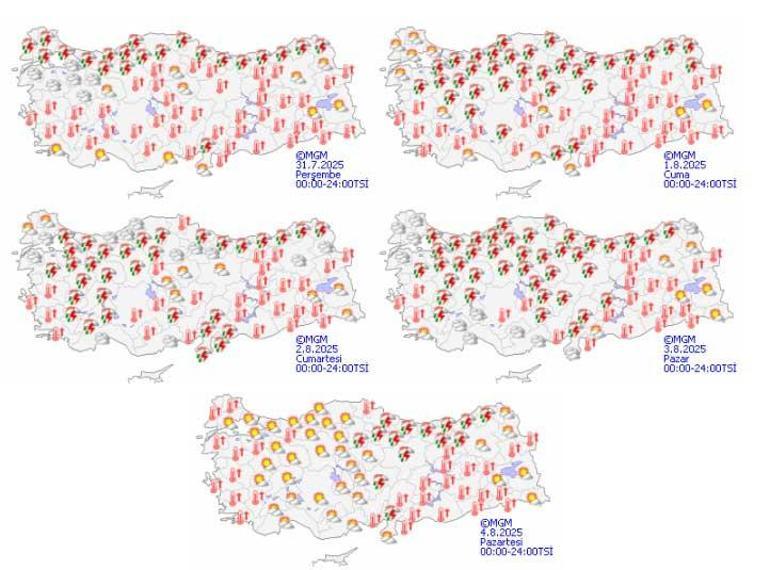 Meteoroloji yeni haritayı paylaştı. Hava sıcaklıkları mevsim normallerinin üzerinde seyredecek. Ancak yarından itibaren batı bölgelerinde, cuma gününden itibaren de iç ve doğu kesimlerde sıcaklıkların 3–6 derece azalması bekleniyor. Hafta sonu boyunca özellikle iç ve kuzey bölgelerde sağanak ve gök gürültülü sağanak yağışlar etkili olacak. Ege ve Akdeniz kıyılarında ise genelde sıcak ve güneşli hava hakim.