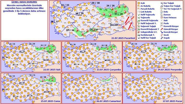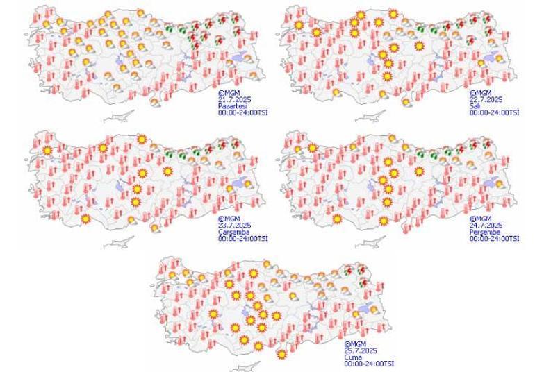 Halen Ülkemizde mevsim normalleri üzerinde seyreden hava sıcaklıklarının, 19 Temmuz 2025 Cumartesi gününden itibaren batı kesimlerden başlayarak artacağı ve Ülkemiz genelinde mevsim normallerinin 6 ilâ 12 derece üzerine çıkacağı tahmin edilmektedir.