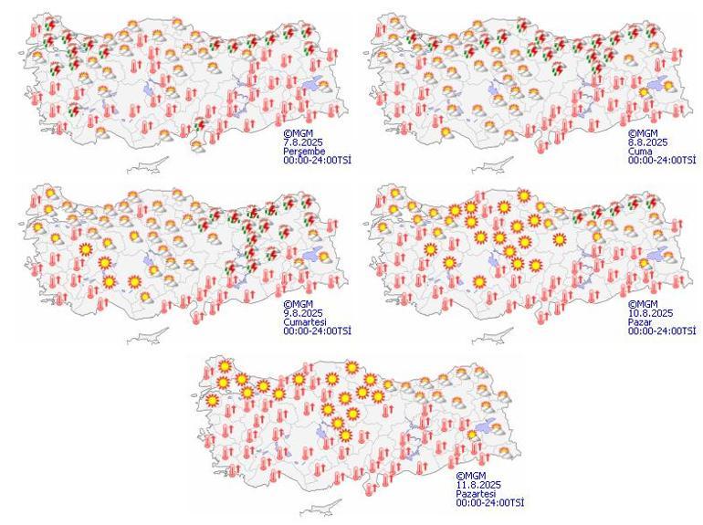 Meteoroloji Genel Müdürlüğü tarafından yapılan tahminlere göre: Ülkemizin kuzey kesimlerinin parçalı, yer yer çok bulutlu, (Bilecik ve Çanakkale hariç) Marmara, Ege’nin iç kesimlerinin kuzey ve güneydoğusu, (Samsun hariç) Orta ve Doğu Karadeniz kıyıları ile Gümüşhane çevreleri ve Doğu Anadolu’nun kuzeydoğusu ile Van’ın doğusu ve İskenderun Körfezi çevrelerinin yerel sağanak ve gök gürültülü sağanak yağışlı, diğer yerlerin az bulutlu ve açık geçeceği tahmin ediliyor. Bu akşam ve gece saatlerinde beklenen yağışların İstanbul ve Balıkesir çevrelerinde yerel kuvvetli olması bekleniyor.