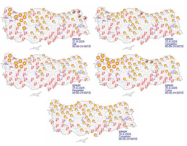 Meteoroloji Genel Müdürlüğü tarafından yapılan tahminlere göre: Ülkemizin kuzeydoğu kesimlerinin parçalı yer yer çok bulutlu, Kars, Ardahan, Artvin’in doğusu, Iğdır’ın güneyi, Ağrı’nın kuzey ve doğusu ile Trabzon ve Rize’nin iç kesimlerinin yerel olmak üzere sağanak ve gök gürültülü sağanak yağışlı, diğer yerlerin az bulutlu ve açık geçeceği tahmin ediliyor.