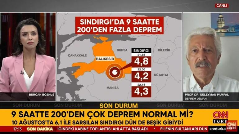 Balıkesir’in Sındırgı ilçesi, son günlerde art arda yaşanan sarsıntılarla gündemde. 10 Ağustos’ta 6.1 büyüklüğündeki depremle sallanan ilçede, dün 9 saat içinde en büyüğü 4.8 olan 200’den fazla deprem kaydedildi. Bu hızlı artış, bölge halkında “deprem fırtınası mı yaşanıyor?” sorusunu gündeme getirirken, Prof. Dr. Süleyman Pampal CNN TÜRK canlı yayınında süreci değerlendirdi.
