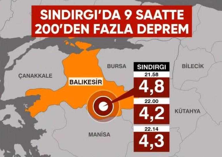 Balıkesir’in Sındırgı ilçesinde, dün akşam saat 21.58’de, 4,8 büyüklüğünde ardından saat 22.00’de 4,2, saat 22.14’te ise 4,3 büyüklüğünde 3 deprem meydana geldi. Gece boyunca Sındırgı ilçesinde artçı sarsıntılar durmadı. Büyüklükleri çoğunlukla 3.0’ın altında olan yüzlerce küçük deprem, bölgeyi salladı.