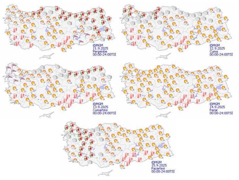 Hava tahmin haritasına göre Türkiye genelinde hava sıcaklıkları artış eğiliminde olacak ve mevsim normallerinin üzerinde seyredecek. Özellikle batı ve güney bölgelerde 35°C’ye yaklaşan yüksek sıcaklıklar dikkat çekiyor. Haftanın ilk günlerinde Karadeniz’in doğusu ve Doğu Anadolu’da sağanak yağışlar görülürken, hafta sonuna doğru Marmara ve Karadeniz’in batısında da yerel yağış geçişleri bekleniyor. İstanbul’da Cuma günü sağanak geçişleri ve önümüzdeki hafta pazartesi ile Salı günü gök gürültülü yağış bekleniyor.