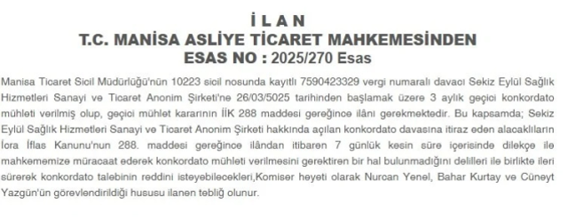 Manisa Asliye Ticaret Mahkemesi, yapılan başvuru üzerine hastaneye 26 Mart 2025’ten geçerli olmak üzere 3 aylık geçici konkordato mühleti verildi. Hastaneye 3 kişilik komiser heyeti atandı. Şirket 3 ay boyunca iflasa sürüklenmemek için uğrayacak.