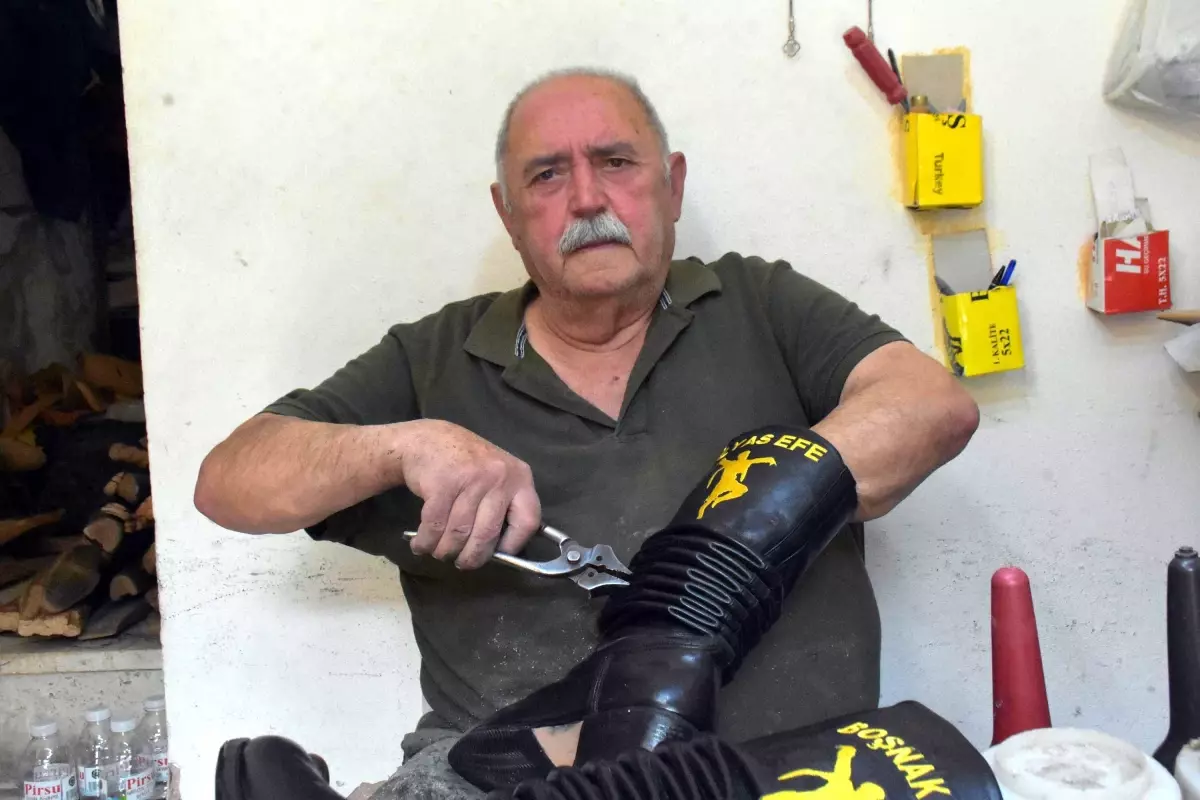 İZMİR’deki körüklü çizme ustası Hasan Hüseyin Öter (75), 11 yaşında çırak olarak başladığı mesleğini 64 yıldır sürdürüyor. Kalıp kullanmadan eliyle körük yapan son usta olan Öter, ayda 8 çift çizme üretiyor.