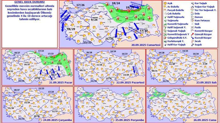 19 Eylül Cuma günü; Giresun ve Trabzon çevrelerinde kuvvetli, Giresun’un doğusu, Trabzon’un batı ve doğu ilçeleri ile Rize ve Artvin’in kuzeyinde çok kuvvetli sağanak ve gök gürültülü sağanak yağış beklenmektedir. Hakkari, Van’ın güneyi ve Bitlis’in doğusunda batı ve güneybatı yönlerden kuvvetli rüzgar ve kısa süreli fırtına beklenmektedir.