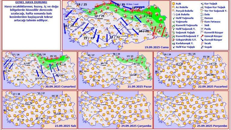 Meteoroloji Genel Müdürlüğü tarafından yapılan tahminlere göre: Ülkemizin kuzey kesimlerinin parçalı, yer yer çok bulutlu, Marmara’nın doğusu ve Karadeniz ile Doğu Anadolu’nun kuzeyinin aralıklı sağanak ve gök gürültülü sağanak yağışlı, diğer yerlerin parçalı ve az bulutlu geçeceği tahmin ediliyor. Yağışların Sakarya, Düzce, Zonguldak, Bartın illeri ile Kastamonu, Bolu ve Karabük’ün kuzey ilçelerinde yerel kuvvetli, zamanla Giresun ve Trabzon çevrelerinde kuvvetli, Giresun’un doğusu, Trabzon’un batı ve doğu ilçeleri ile Rize ve Artvin’in kuzeyinde çok kuvvetli olması bekleniyor.