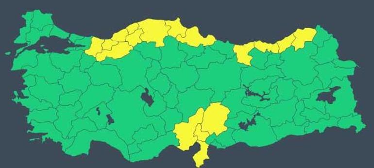 Meteoroloji Genel Müdürlüğünden alınan bilgiye göre, “Adana, Artvin, Bolu, Giresun, Hatay, Kastamonu, Kahramanmaraş, Rize, Sakarya, Samsun, Sinop, Trabzon, Zonguldak, Bartın, Karabük, Osmaniye, Düzce” için yerel kuvvetli sağanak ve gök gürültülü sağanak sebebiyle sarı uyarı verildiği bildirildi.