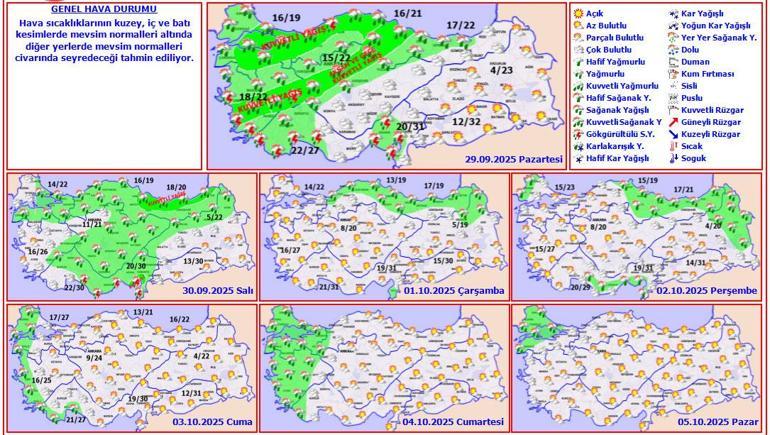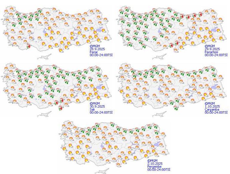 Meteoroloji Genel Müdürlüğü tarafından yapılan tahminlere göre: Ülkemizin kuzeybatı kesimlerinin parçalı, yer yer çok bulutlu, Antalya çevreleri ile akşam saatlerinden sonra Marmara, Batı Karadeniz ile İzmir’in kuzey ilçelerinin yerel sağanak ve gök gürültülü sağanak yağışlı, diğer yerlerin az bulutlu ve açık geçeceği tahmin ediliyor. Sabah saatlerinde Karadeniz’in iç kesimlerinde pus ve yer yer sis bekleniyor.