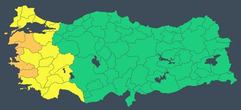Yarın ise, “Afyonkarahisar, Antalya, Burdur, Bursa, Denizli, Edirne, Isparta, İstanbul, Kırklareli, Kocaeli, Kütahya, Manisa, Muğla, Tekirdağ, Uşak, Yalova” için sarı “Aydın, Balıkesir, Çanakkale, İzmir” için turuncu uyarı yapıldı.