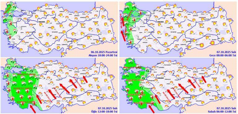 KUVVETLİ YAĞIŞ UYARISI: Yağışların; Marmara, Ege ve Batı Akdeniz ile Ankara’nın batı ilçeleri ve Eskişehir çevrelerinde kuvvetli, Güney ve Kuzey Ege kıyılarında çok kuvvetli ve yerel şiddetli olması beklendiğinden, oluşabilecek olumsuzluklara (ulaşımda aksamalar, sel, su baskını, vb) karşı dikkatli ve tedbirli olunması gerekmektedir.