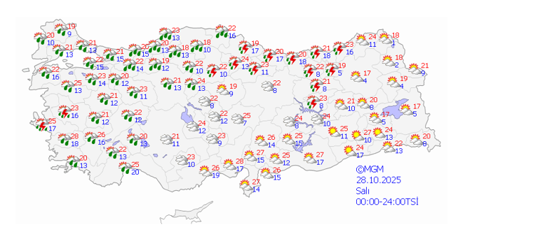 Meteoroloji Genel Müdürlüğünden alınan tahminlere göre; yurdun genelinin parçalı yer yer çok bulutlu, Marmara, Kuzey ve Kıyı Ege, Batı Karadeniz (Sinop hariç) ile Eşkişehir çevreleri, Ankara ve Çankırı’nın batı ilçeleri, İskenderun Körfezi ve Doğu Akdeniz Toroslar Mevkii’nin sağanak ve gök gürültülü sağanak yağışlı, diğer yerlerin az bulutlu geçmesi bekleniyor.