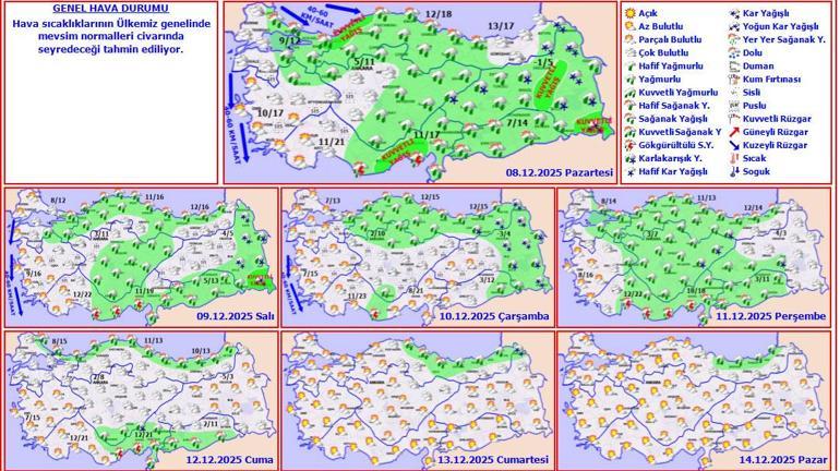 Bu hafta Türkiye genelinde sıcaklıklar mevsim normalleri civarında seyrediyor. Haftanın ilk yarısında özellikle Karadeniz, Marmara’nın doğusu, İç Anadolu’nun kuzeyi ve Akdeniz’in doğusunda yağışların etkili olduğu görülüyor. Yağışlar çoğunlukla yağmur şeklinde, zaman zaman kuvvetli sağanaklara dönüşüyor. Batı bölgelerinde ise yer yer parçalı bulutlu ve az bulutlu bir hava hâkim. Rüzgârın özellikle Karadeniz kıyılarında kuzey ve kuzeydoğudan zaman zaman kuvvetli esmesi bekleniyor.