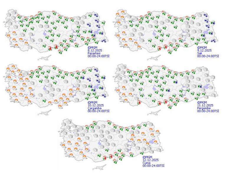 Meteoroloji Genel Müdürlüğü tarafından yapılan tahminlere göre: Ülkemiz genelinin parçalı ve çok bulutlu, Marmara, İç Anadolu ve Akdeniz’in doğu kesimleri, Batı Karadeniz ile Doğu Anadolu (Erzincan, Erzurum, Ardahan, Van ve Iğdır Hariç), Güneydoğu Anadolu(Şanlıurfa hariç) ve Giresun çevrelerinin aralıklı yağışlı geçeceği tahmin ediliyor. Genellikle yağmur ve sağanak, Akdeniz kıyılarında yer yer gök gürültülü sağanak, Giresun’un iç kesimlerinin yüksekleri ile Doğu Anadolu’nun kuzey ve doğusunda karla karışık yağmur ve yer yer kar şeklinde görülecek olan yağışların Batı Karadeniz kıyıları ile Mersin ve Adana çevrelerinde yer yer kuvvetli olması bekleniyor.