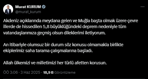 Kurum “Akdeniz açıklarında meydana gelen ve Muğla başta olmak üzere çevre illerde de hissedilen 5,8 büyüklüğündeki deprem nedeniyle tüm vatandaşlarımıza geçmiş olsun dileklerimi iletiyorum. An itibariyle olumsuz bir durum söz konusu olmamakla birlikte ekiplerimiz saha tarama çalışmalarına başladı. Allah ülkemizi ve milletimizi her türlü afetten korusun.” ifadelerini kullandı.