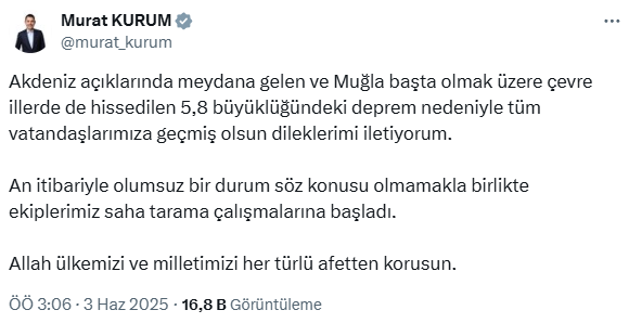 Kurum “Akdeniz açıklarında meydana gelen ve Muğla başta olmak üzere çevre illerde de hissedilen 5,8 büyüklüğündeki deprem nedeniyle tüm vatandaşlarımıza geçmiş olsun dileklerimi iletiyorum. An itibariyle olumsuz bir durum söz konusu olmamakla birlikte ekiplerimiz saha tarama çalışmalarına başladı. Allah ülkemizi ve milletimizi her türlü afetten korusun.” ifadelerini kullandı.