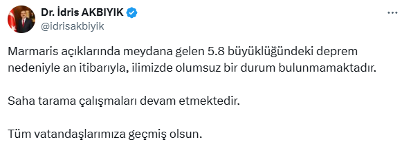 Sosyal medya hesabından depreme ilişkin açıklama yapan Muğla Valisi İdris Akbıyık da kentte an itibarıyla yıkım bulunmadığını duyurdu.
