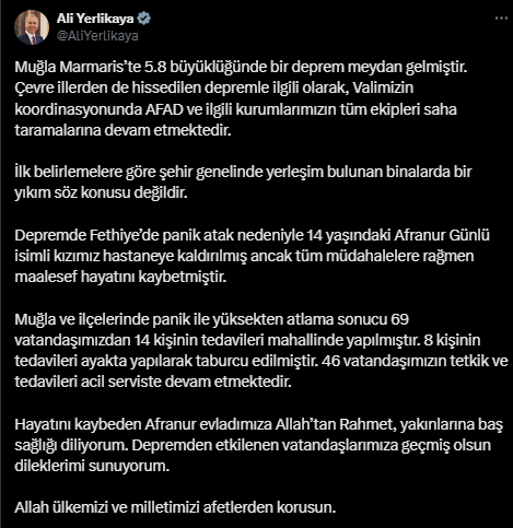 Depremde Fethiye’de panik atak nedeniyle 14 yaşındaki Afranur Günlü isimli kızımız hastaneye kaldırılmış ancak tüm müdahalelere rağmen maalesef hayatını kaybetmiştir. Muğla ve ilçelerinde panik ile yüksekten atlama sonucu 69 vatandaşımızdan 14 kişinin tedavileri mahallinde yapılmıştır. 8 kişinin tedavileri ayakta yapılarak taburcu edilmiştir. 46 vatandaşımızın tetkik ve tedavileri acil serviste devam etmektedir. Hayatını kaybeden Afranur evladımıza Allah’tan Rahmet, yakınlarına baş sağlığı diliyorum. Depremden etkilenen vatandaşlarımıza geçmiş olsun dileklerimi sunuyorum. Allah ülkemizi ve milletimizi afetlerden korusun.”