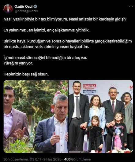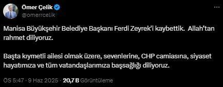 “Geçirdiği kaza neticesinde üç gündür yoğun bakımda tedavi gören Manisa Büyükşehir Belediye Başkanı Sayın Ferdi Zeyrek’in vefatını büyük bir üzüntüyle öğrendim. Sevgili kardeşimiz Ferdi Başkan’a Allah’tan rahmet, kederli ailesine sabır, başta Sayın Özgür Özel olmak üzere tüm Cumhuriyet Halk Partisi camiasına ve Manisa halkına başsağlığı diliyorum. Ruhu şad, mekânı Cennet olsun.”