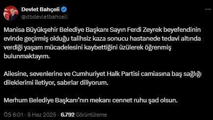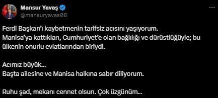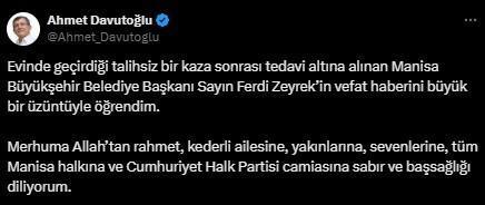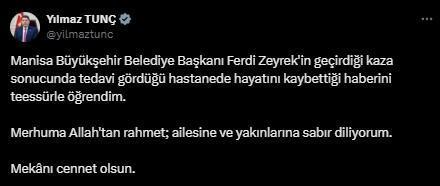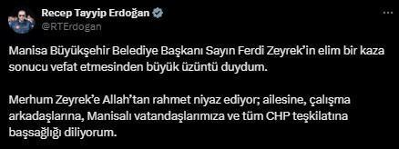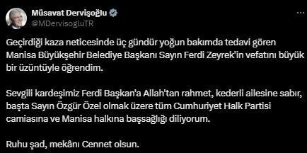 “Manisa Büyükşehir Belediye Başkanı Ferdi Zeyrek’in geçirdiği kaza sonucunda tedavi gördüğü hastanede hayatını kaybettiği haberini teessürle öğrendim. Merhuma Allah’tan rahmet; ailesine ve yakınlarına sabır diliyorum. Mekânı cennet olsun.”