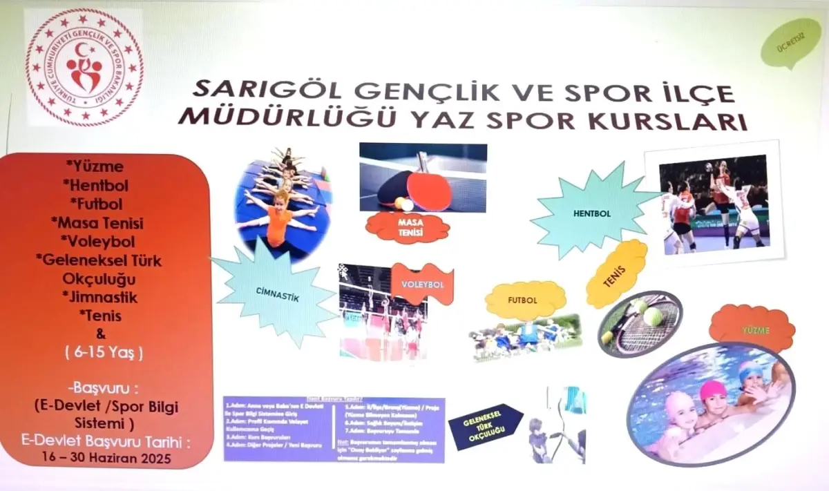 Sarıgöl Gençlik ve Spor İlçe Müdürü Gökhan Yıldırım yaptığı açıklamada, “Sarıgöl Gençlik ve Spor İlçe Müdürlüğü olarak, yaz boyunca düzenleyeceğimiz hentbol, voleybol, yüzme, cimnastik, tenis, masa tenisi, geleneksel Türk okçuluğu ve futbol kurslarına tüm çocuk ve gençlerimizi davet ediyoruz” dedi. – MANİSA