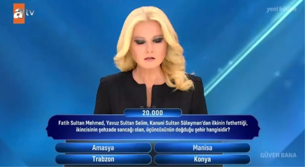 Fatih Sultan Mehmet, Yavuz Sultan Selim, Kanuni Sultan Süleyman’dan ilkinin fethettiği ikicisinin şehzade sancağı olan üçüncüsünün doğduğu şehir hangisidir? sorusu, Güven Bana yarışmasında merak edilen sorulardan biri oldu. Peki, Fatih Sultan Mehmet, Yavuz Sultan Selim, Kanuni Sultan Süleyman’dan ilkinin fethettiği ikicisinin şehzade sancağı olan üçüncüsünün doğduğu şehir hangisidir? cevabı nedir? İşte Güven Bana cevapları!