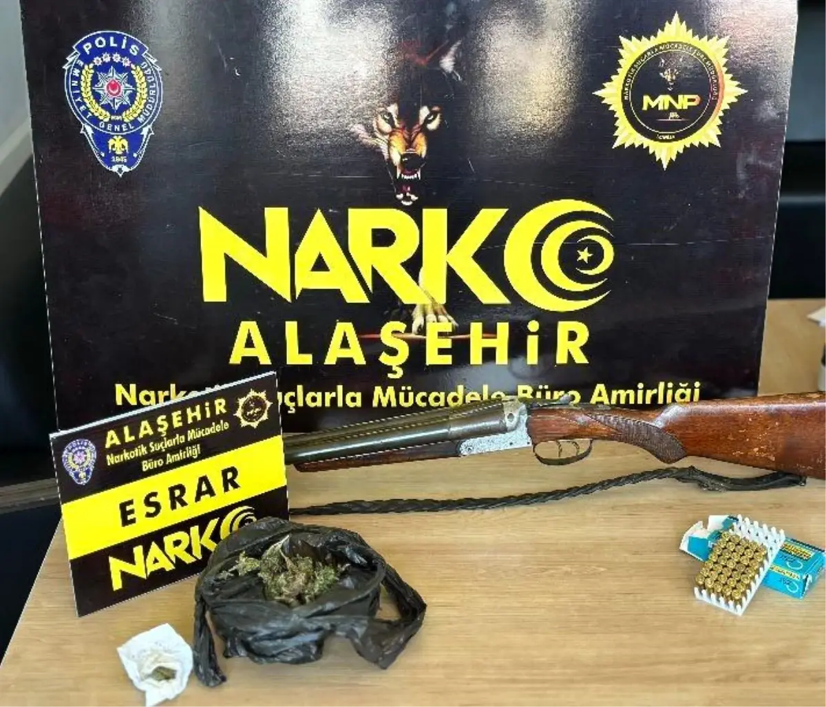 Manisa İl Emniyet Müdürlüğü Narkotik Suçlarla Mücadele Şube Müdürlüğü ve Alaşehir Narkotik Büro Amirliği ekipleri tarafından yapılan çalışmada, şüphelinin üzerinde ve adresinde yapılan aramalarda 1,5 gram metamfetamin, 51 adet sentetik ecza hapı, 2 parça halinde 50,18 gram esrar maddesi, 35 adet 9×19 mm çapında mermi ve 1 adet av tüfeği ele geçirildi.