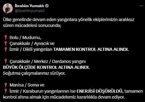 Bakan Yumaklı açıklamasında şu ifadeleri kullandı: “Ülke genelinde devam eden yangınlara yönelik ekiplerimizin aralıksız süren mücadelesi sonucunda; Çanakkale / Ayvacık ve İzmir / Dikili yangınları tamamen kontrol altına alındı.