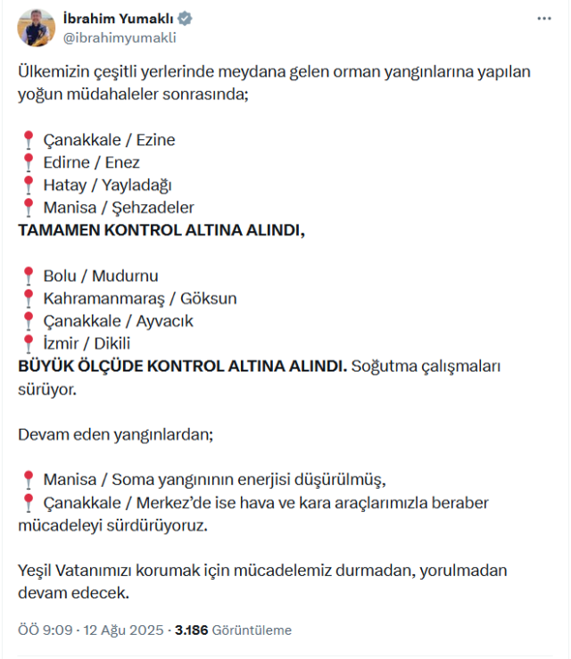 Bakan Yumaklı, “Çanakkale Ezine, Edirne Enez, Hatay Yayladağı ve Manisa Şehzadeler’deki orman yangınları, yoğun müdahalelerimiz sonucunda tamamen kontrol altına alındı. Bolu Mudurnu, Kahramanmaraş Göksun, Çanakkale Ayvacık, İzmir Dikili büyük ölçüde kontrol altına alındı. Soğutma çalışmaları sürüyor. Devam eden yangınlardan; Manisa Soma yangınının enerjisi düşürülmüş, Çanakkale Merkez’de ise hava ve kara araçlarımızla beraber mücadeleyi sürdürüyoruz.” denildi.