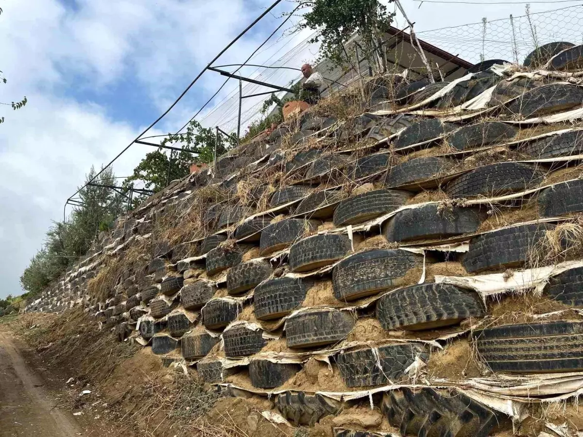 Sarıgöl ilçesi Emcelli Mahallesi’nde yaşayan çiftçi Ahmet Tosun, 7 yıl önce bağ evinin önünde olabilecek bir toprak kaymasını önlemek için farklı bir yöntem geliştirdi. Beton set duvar yerine maliyeti daha az olan üç tır dolusu ömrünü tamamlamış traktör ve kamyon lastiğiyle kale gibi bir duvar ören Tosun, hem evini korudu hem de geri dönüşüme örnek oldu.