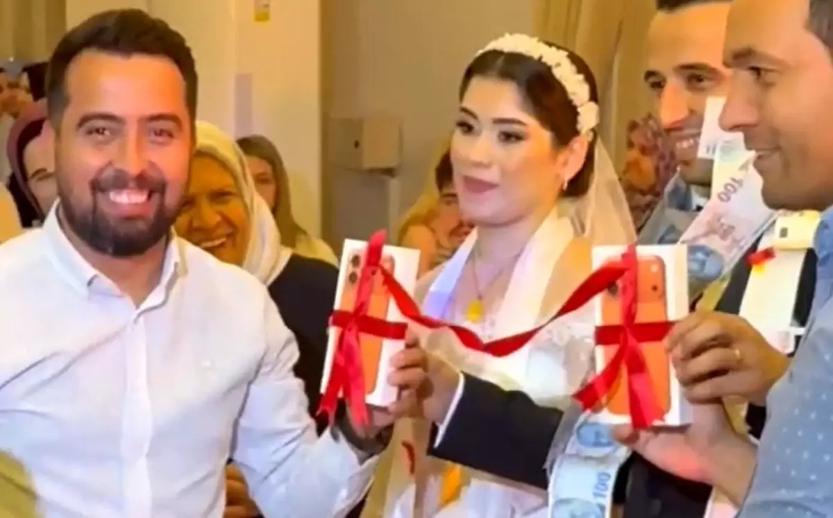 Manisa’nın Turgutlu ilçesindeki bir düğünde damadın arkadaşları, gelenekselleşmiş altın takısı yerine gelin ve damada son model bir iPhone hediye ederek tüm davetlileri şaşırttı.