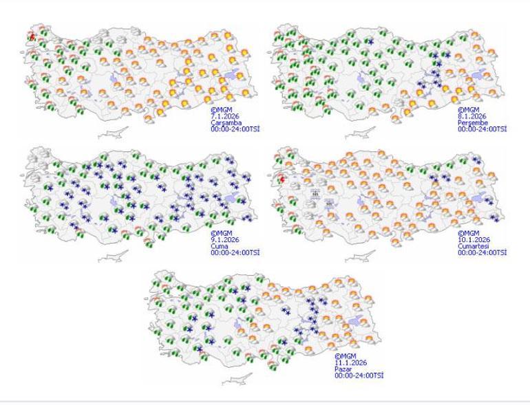 Meteoroloji verdiği verilere göre cuma günü karla karışık yağmur önümüzdeki pazartesi ve salı günü kar ve karla karışık yağmur görülecek. Öte yandan cuma gününe yurdun büyük bölümünde kar yağışı bekleniyor.